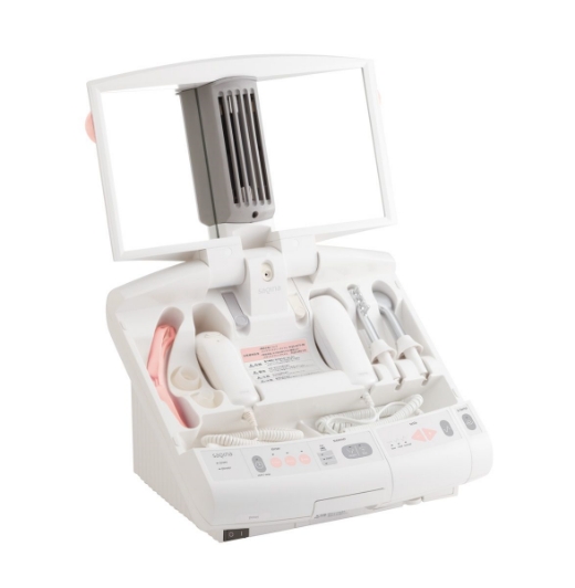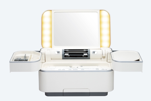 ホームスキンケアマシンとして国内初のダブルスチーマーを搭載でたっぷりうるおいをチャージする本格派。鏡の左右に自然光に近い照明がつき、機能も雰囲気もエステサロン級。